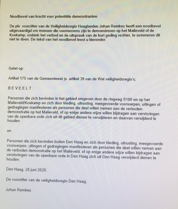 De angst van de overheid voor de tegenstanders van het corona-overheidsbeleid lijkt inmiddels enorm goot. Werd eerder de demonstratie in Den Haag op zondag 21 juni verboden, ook de demonstratie op zondag 28 juni in Den Haag werd verboden. Omdat er toch mensen kwamen vaardigde interim burgemeester Remkes op de dag van de demonstratie ook nog eens een noodbevel uit. Iedereen heeft het recht te demonstreren. Een burgemeester mag een demonstratie verbieden ter bestrijding of voorkoming van wanordelijkheden.